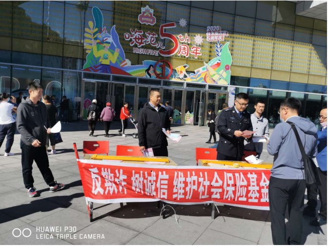 在万达广场,局基金监督科、市社保局、市劳动保障监察局、市城乡居民保险局工作人员主要针对城乡居民和职工,进行树诚信、反欺诈,维护社会保险基金安全为主的诚信宣传,向过往群众发放《社会保险基金风险警示教育问答》等资料300余份。市城乡居民保险局为进一步确保领取待遇人员按时进行生存认证,杜绝冒领行为,印制了《致广大城乡居民养老保险待遇人员的一封信》,详细介绍了认证范围、时间、不按时进行生存认证的后果,为群众演示了方便快捷