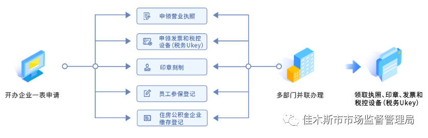 企业到政务服务大厅“企业开办专窗”通过一表申请,一次提交申请材料后,即可现场等候领取营业执照、公章、发票和Ukey“套餐”。