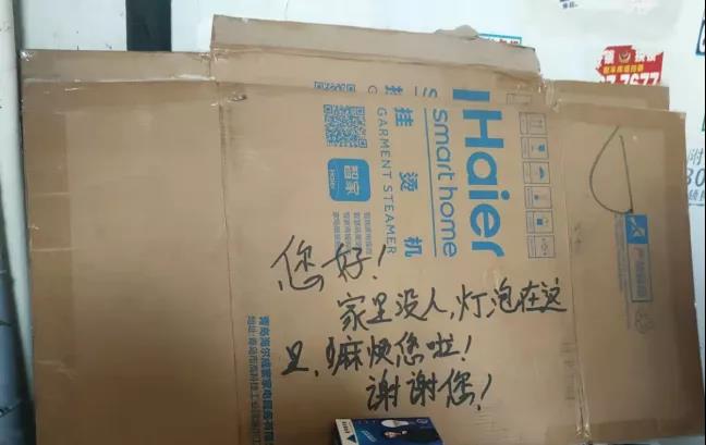 网格员来到该单元的三楼,看见阿姨门口已经准备好了登高的凳子,并且留言:“您好!家里没人,灯泡在这里,麻烦您啦!谢谢您!”看到阿姨的留言后,她踩上凳子及时把灯泡换下。