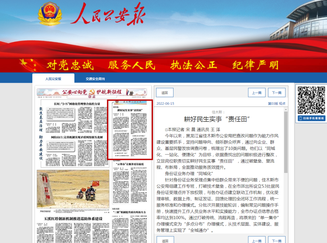 6月15日《人民公安报》03版刊发《佳木斯:耕好民生实事“责任田”》信息,点赞佳木斯市公安局今年以来,把查改问题作为能力作风建设重要抓手,坚持问题导向、倾听群众呼声,把公安工作做到老百姓心坎上。