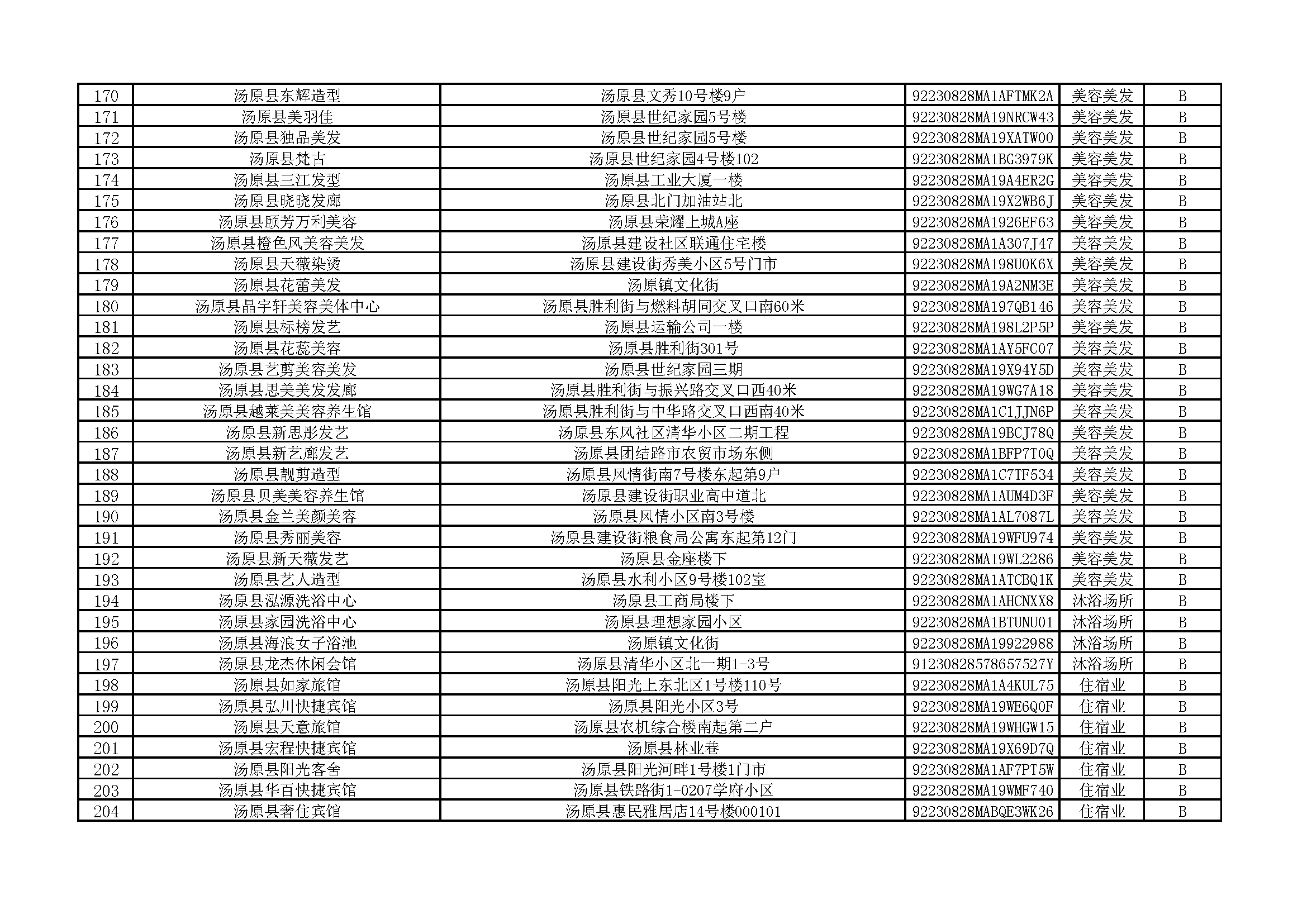 为认真贯彻落实《黑龙江省公共场所卫生信用分类监管办法(试行)》,创造良好的社会信用环境,促进公共场所规范诚信经营,提升公共卫生安全保障,佳木斯市卫生健康委组织全市开展公共场所卫生信用等级评价工作,对评价结果为A级(信用优秀)、B级(信用良好)单位,在卫生信用等级有效期内实行宽松信任化监管、宽松包容化监管。上半年公共场所卫生信用等级评价A级单位4家、B级单位375家,现予以公示。