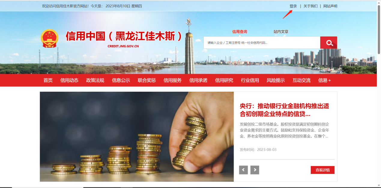 进入“信用中国(黑龙江佳木斯)”网站主界面,在右上角右上角“登录”功能,跳转到统一身份认证平台如图所示: