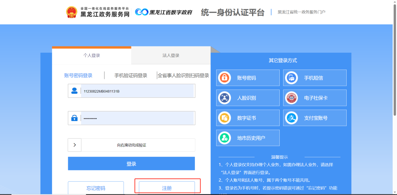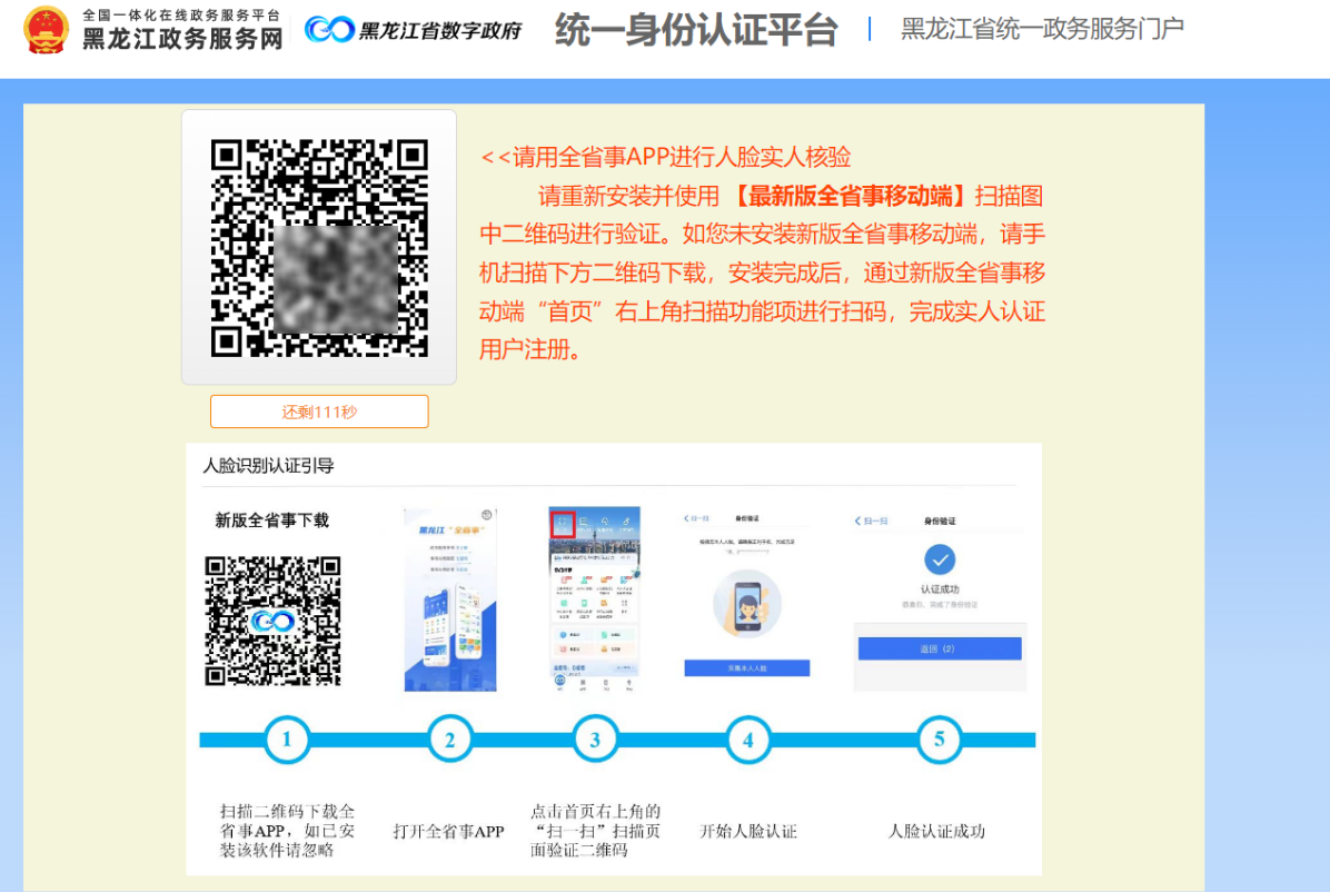 注册流程:首次注册的用户需要人脸实名认证。需要使用电脑注册,跳转到上图所示页面后在上方选择个人登录,在按要求填写信息后点击下方红框所示按钮注册,注册成功后会跳转到二维码认证界面。然后手机扫左下角小二维码下载新版黑龙江全省事,下载后启动应用,不登录账号直接进入全省事,在首页右上角打开扫一扫功能,扫电脑屏幕上方的二维码进行实名认证,左上角二维码有时间限制,过期后可选择更新二维码,实名成功后再回到网站首页进行登录。