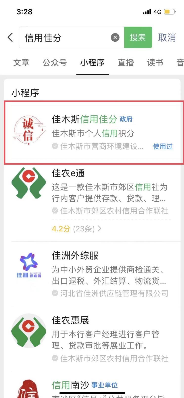 微信搜索“信用佳分”小程序,搜索到的小程序如下图红框内所示: