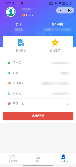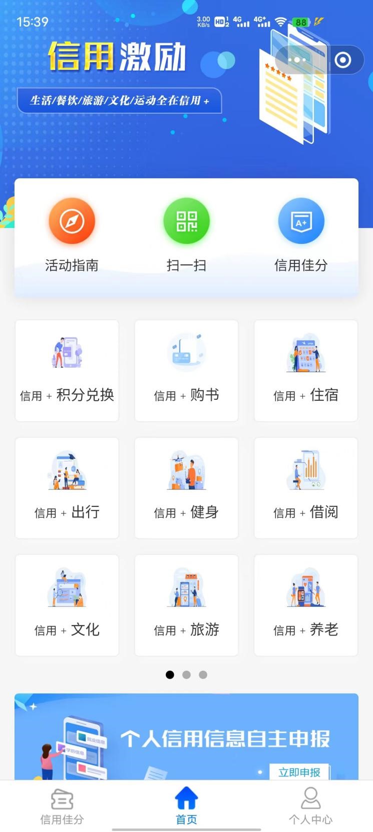 登录后,在小程序首页中心部分可以查看激励场景、信用分及信用等级,并可参与信用激励活动。