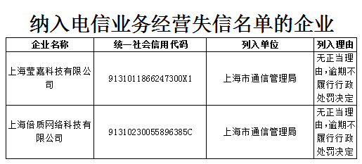 据工业和信息化部网站消息,2020年三季度,依据《电信条例》《电信业务经营许可管理办法》等相关规定,38家企业因违规收集用户信息、违反电话和网络实名制规定、无证经营电信业务、不配合调查等违法违规行为,受到电信管理机构行政处罚并被纳入电信业务经营不良名单;2家企业因逾期不履行行政处罚决定被纳入电信业务经营失信名单。现予以公布,详细信息可登陆全国电信业务市场综合管理信息系统(https://tsm.miit.gov.cn)查询。