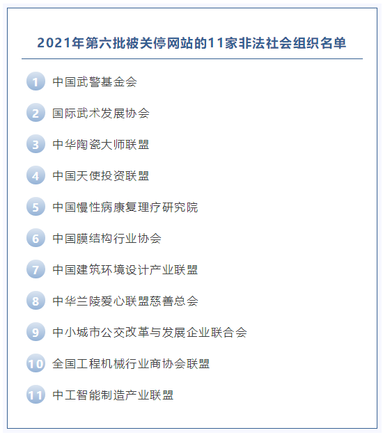 此次的关停涉及中国武警基金会、国际武术发展协会、中华陶瓷大师联盟、中国天使投资联盟、中国慢性病康复理疗研究院等11家已被取缔的非法社会组织。