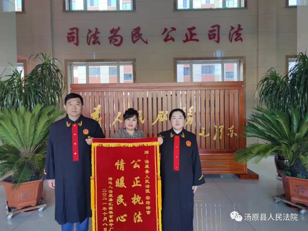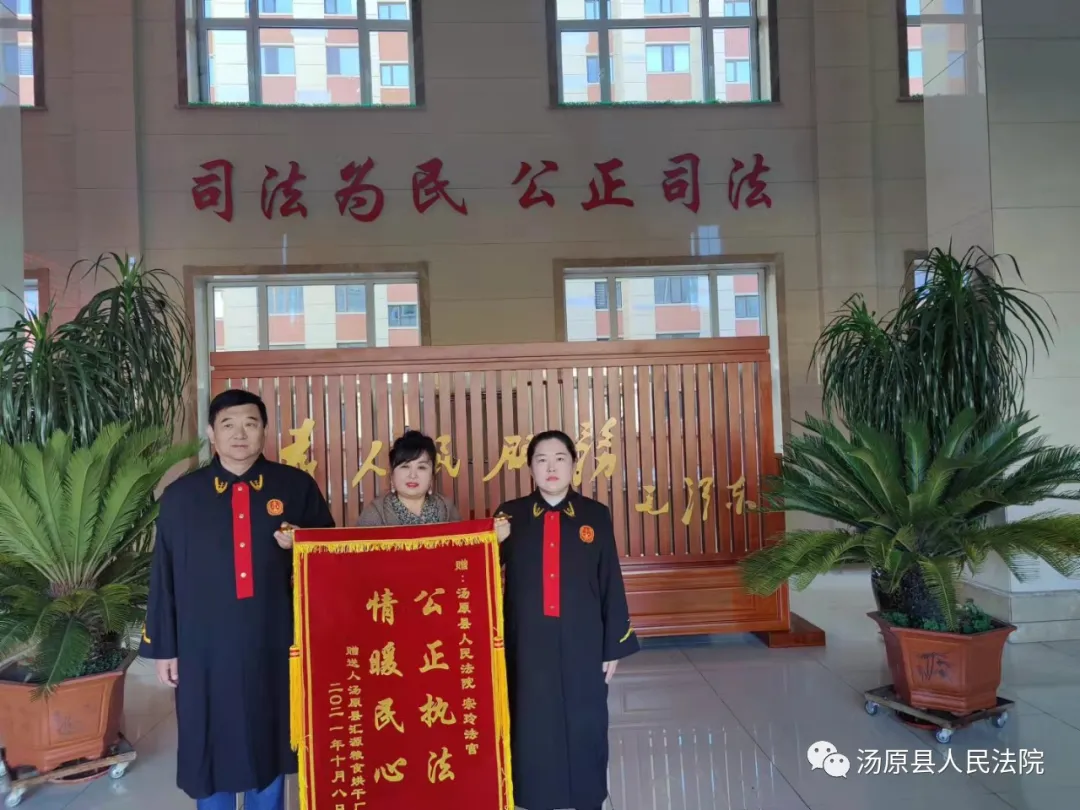 一面锦旗,一份认可,人民群众是否满意是法院干警为之奋斗的终极目标,人民群众的信任与认可是法院干警付出的最好回报。鲜红的锦旗是当事人对法院工作的嘉许,是法院干警继续拼搏的不竭动力,更是对法官进一步提升办案能力和办案质效的鞭策。汤原县法院全体警将继续以坚持司法为民、公正司法为主线,努力让人民群众在每一起案件中感受到公平和正义。