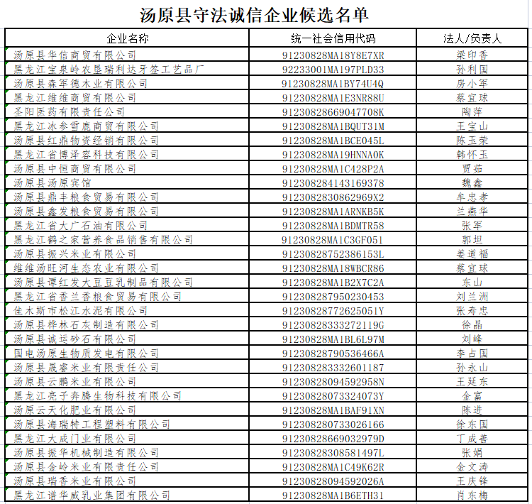 按照《汤原县守法诚信企业创建实施方案》文件要求,在全县树立广泛性和代表性的诚信典型企业,进一步增强企业的诚信经营意识。汤原县信用办通过基础名单建立、部门推荐、综合研判等阶段,现推荐汤原县第二批守法诚信企业32家,候选名单公示如下。