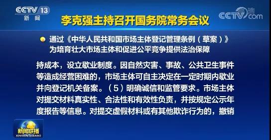 近日,国务院总理李克强主持召开国务院常务会议,通过《中华人民共和国市场主体登记管理条例(草案)》,为培育壮大市场主体和促进公平竞争提供法治保障。