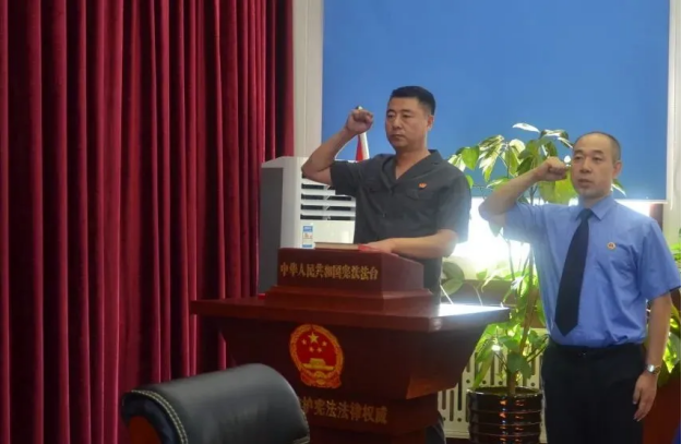 新当选人员在汤原县人大常委会主任邹卫东的监誓下,由汤原县人民法院代理院长石广玉同志领誓,面向国徽,庄严向宪法宣誓。
