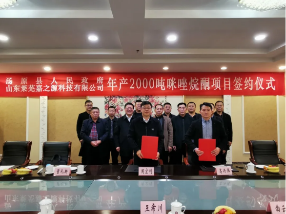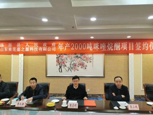 11月27日,汤原县人民政府与山东嘉之源生物科技有限公司在山东莱芜举行年产2000吨咪唑烷酮项目签约仪式。县委副书记、县长国宏利,山东嘉之源生物科技有限公司董事长王加湖、执行董事王希川、总经理高兴伟及汤原县相关部门负责同志出席签约仪式。
