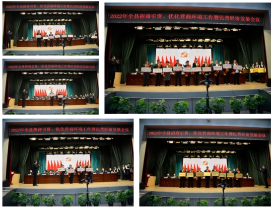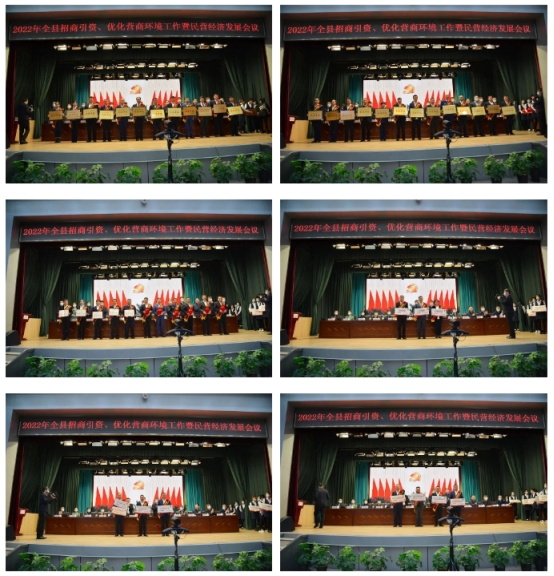 会上,向获得县招商引资工作先进单位、为招商引资提供优质服务先进单位、招商引资先进个人、招商引资突出贡献先进个人、招商引资项目引荐人、2021年投资企业基础设施配套奖励、2021年度新入规企业、2021年度高新技术企业、2021年度税收贡献优秀企业、2021年度新纳入限上商贸企业、金融支持地方经济突出贡献奖的单位、个人和企业进行了表彰奖励。