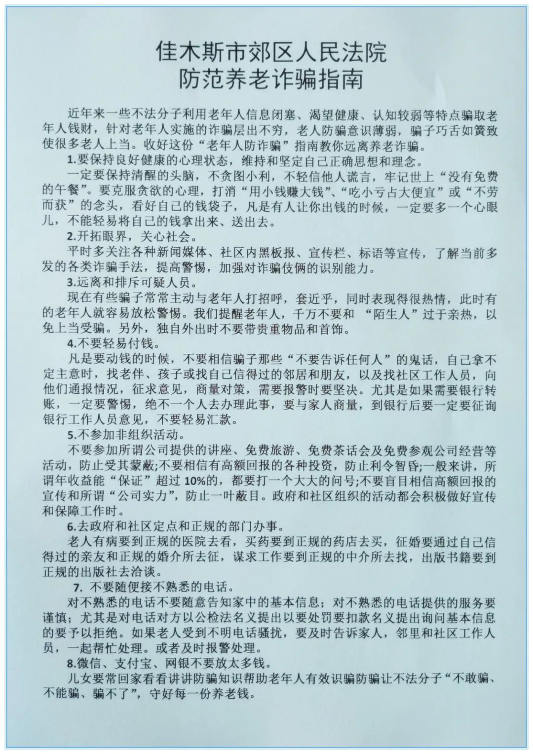 通过此次宣传活动,郊区人民法院干警及时更新老年人接触不到的反诈手段,破除不法分子利用老年人信息闭塞、渴望健康、认知较弱等诈骗招数,提升了老年人识诈防诈的意识和能力,对于老年人因被骗造成的财产损失起到预防作用,受到了辖区老年人们的认可和肯定,郊区人民法院将持续开展打击整治养老诈骗专项行动,依法严惩养老诈骗犯罪,为广大老年人安享晚年营造良好法治氛围。
