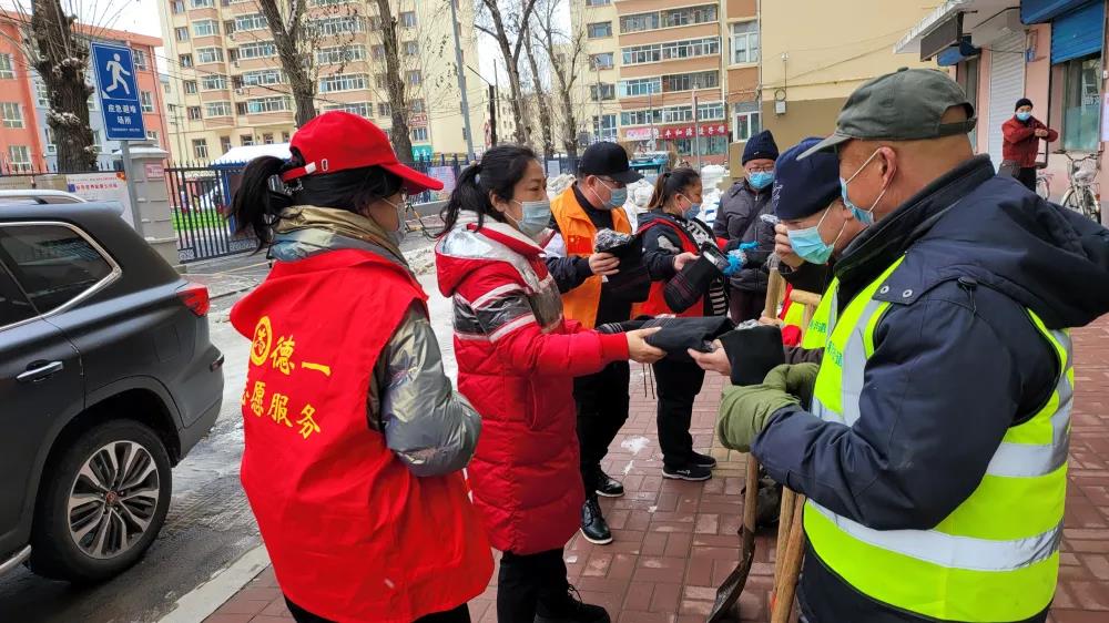 冬日的寒冷挡不住志愿的温暖。为了让环卫工人能在工作中感受到温暖,德一志愿者为他们送去了帽子、手套、鞋垫、热帖等防寒防护物资,助他们抵御寒潮。