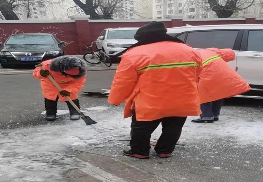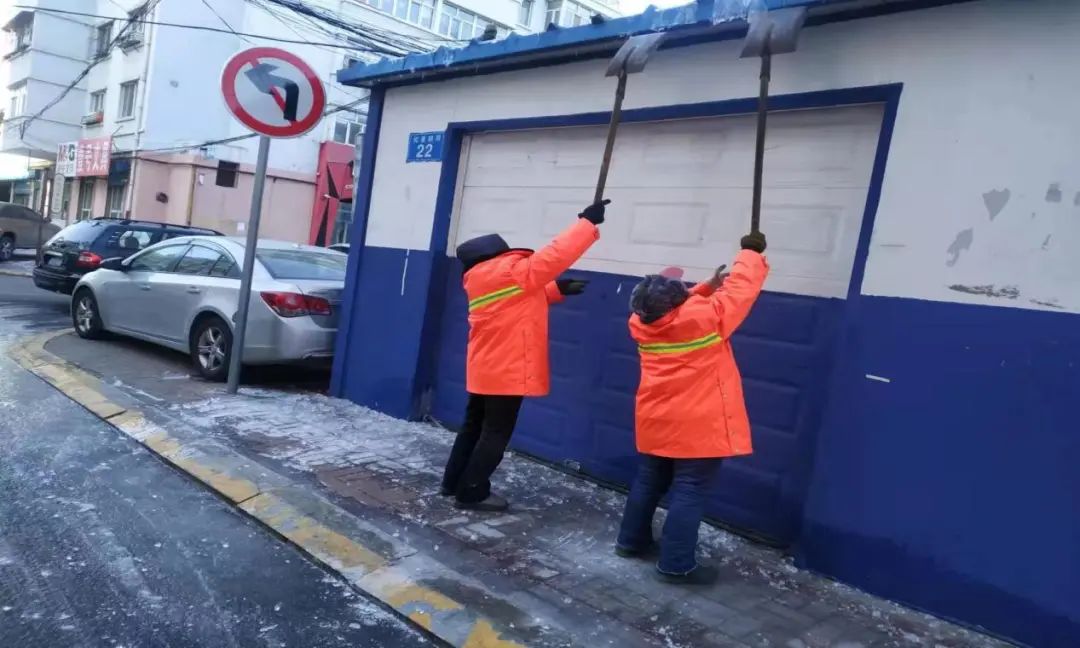 会战中保洁工作人员用铁锹等工具对辖区内可能坠落的冰溜子及时处理,并对污水、积雪和垃圾混合形成的冰冻混合物进行清理,消除了安全隐患问题。他们忙碌的身影成为寒风中一道动人的风景线,维护了行人和车辆的交通安全,得到了居民们的赞赏。