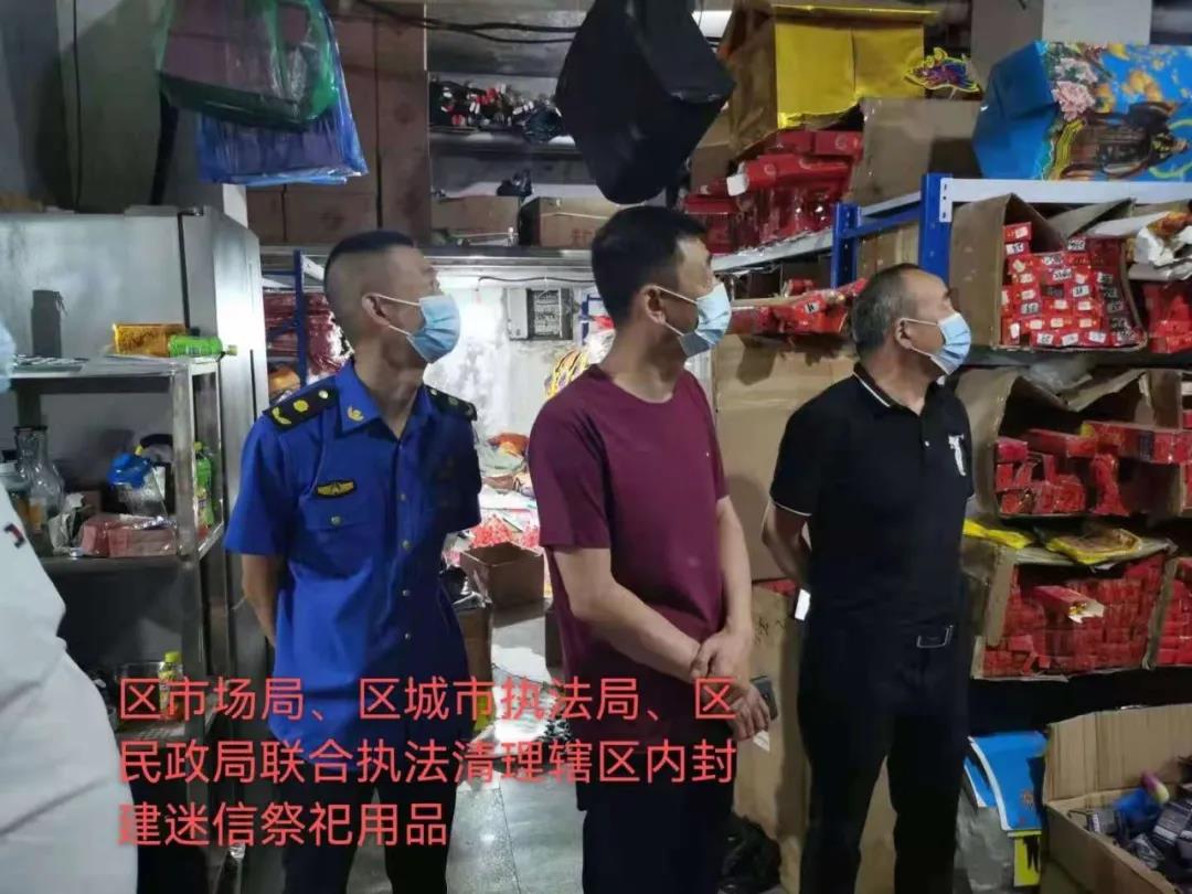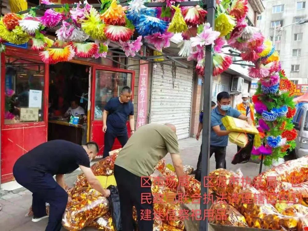 8月18日,在向阳区市场监督管理局领导的带领下,与区城市管理综合执法局、区民政局联合对辖区经营、销售祭祀用品的门店进行了全方位、无缝隙的监督检查。检查组仔细查看各门店销售、运输封建迷信祭祀用品的情况,对在检查中发现的制造、销售、运输封建迷信祭祀用品,立即下架处理,同时及时受理有关殡葬用品的消费申诉举报。