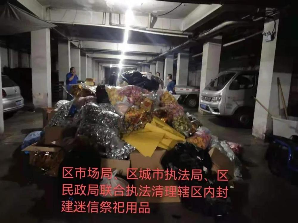 此次专项检查出动执法人员15人次,执法车辆6台次,查扣元宝320余袋、冥币230余箱、其他各类违规祭祀用品500余件(箱)。