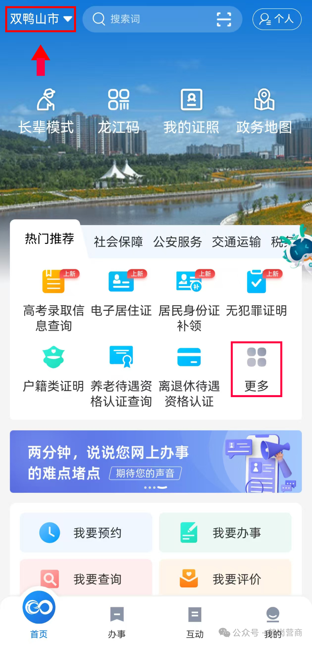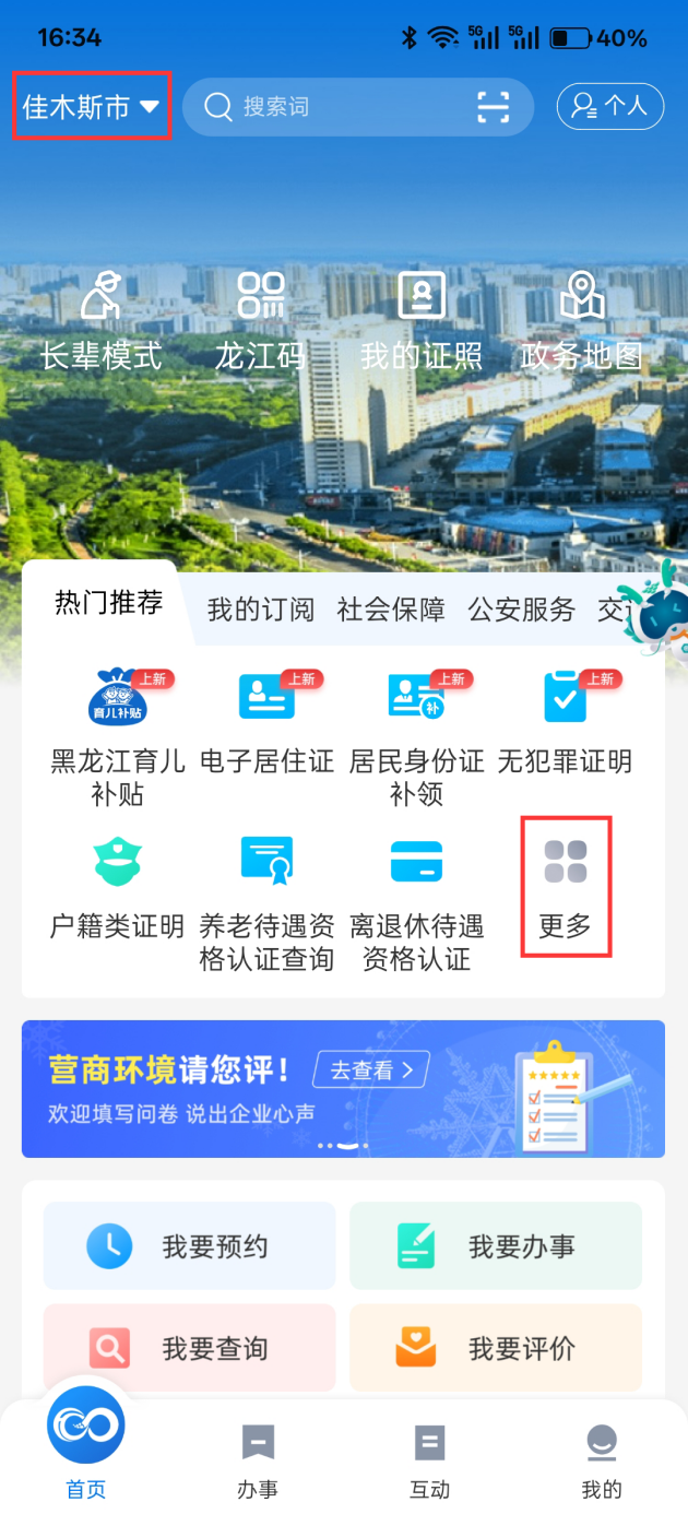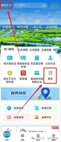 一、手机端下载“龙易办”APP,在左上角定位参与城市,中间位置选择“更多”;