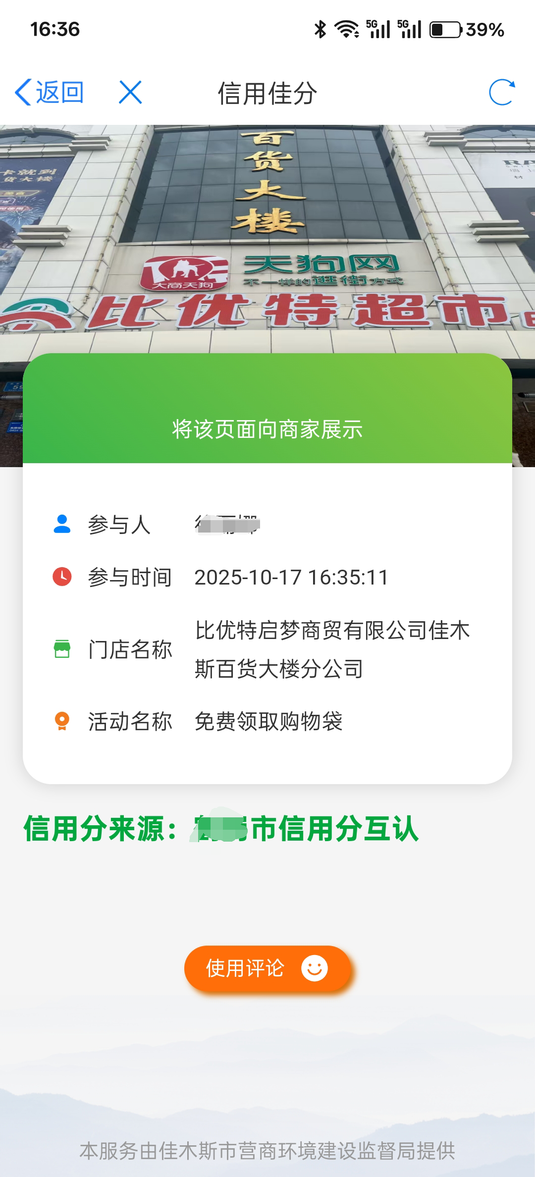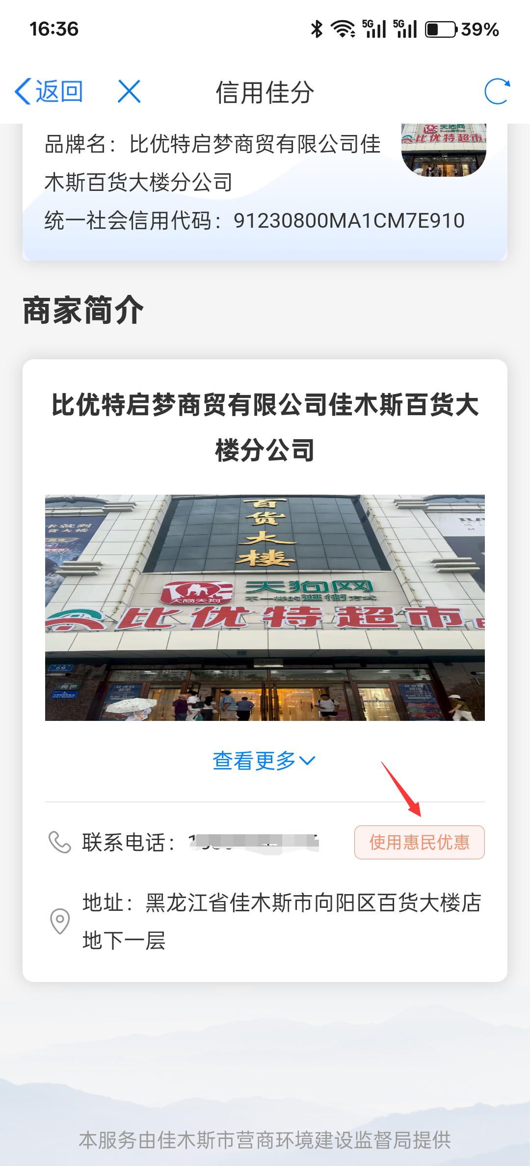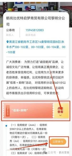 四、进入“信易+购物”场景,选择要参与的门店,点击进入,往下找到“使用惠民优惠”进入后,点击查看,根据自己的信用分数,查看可参与的活动点击“立即参与”,超市进行现场核销后,即可享受相应场景优惠政策;