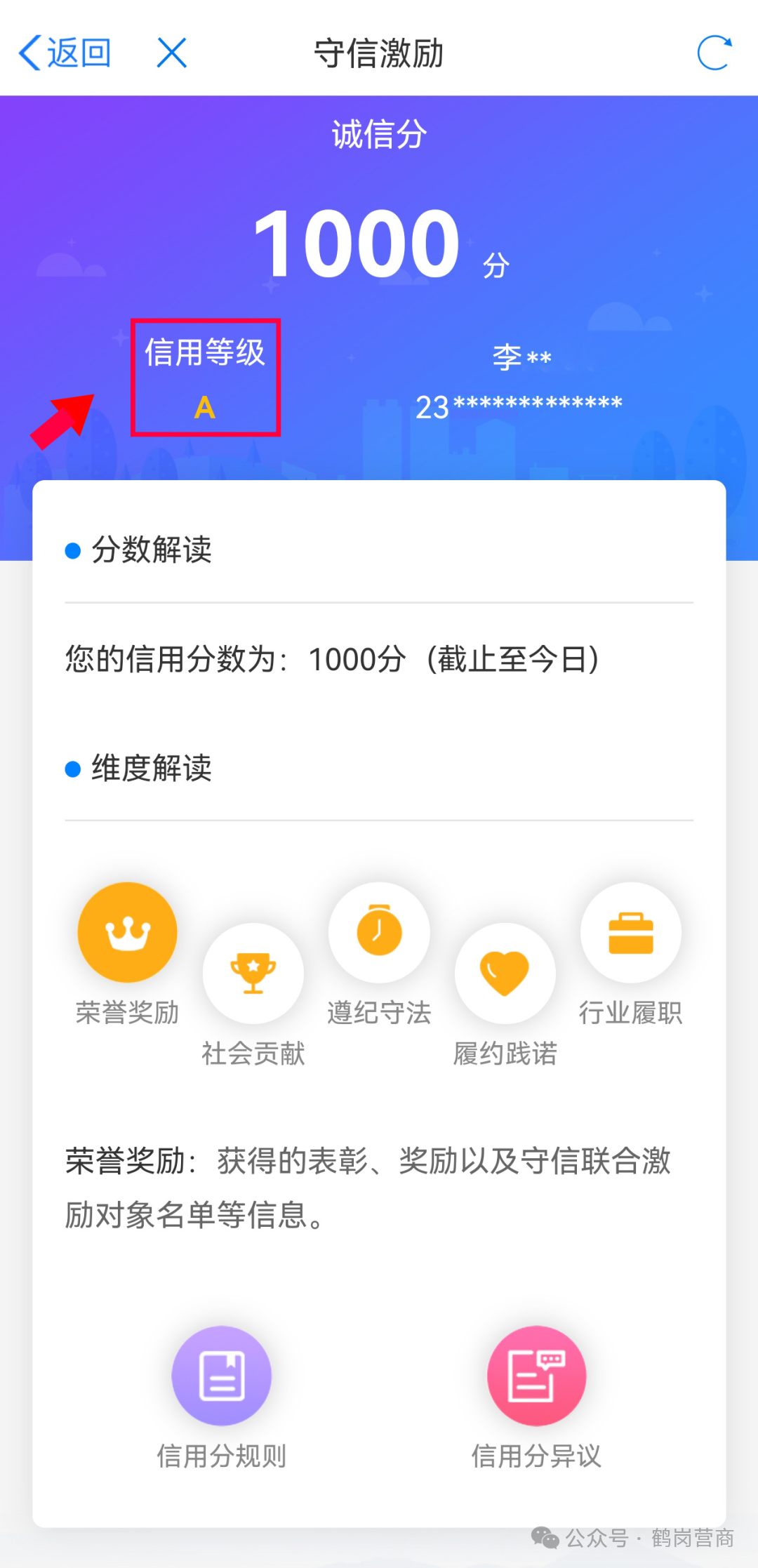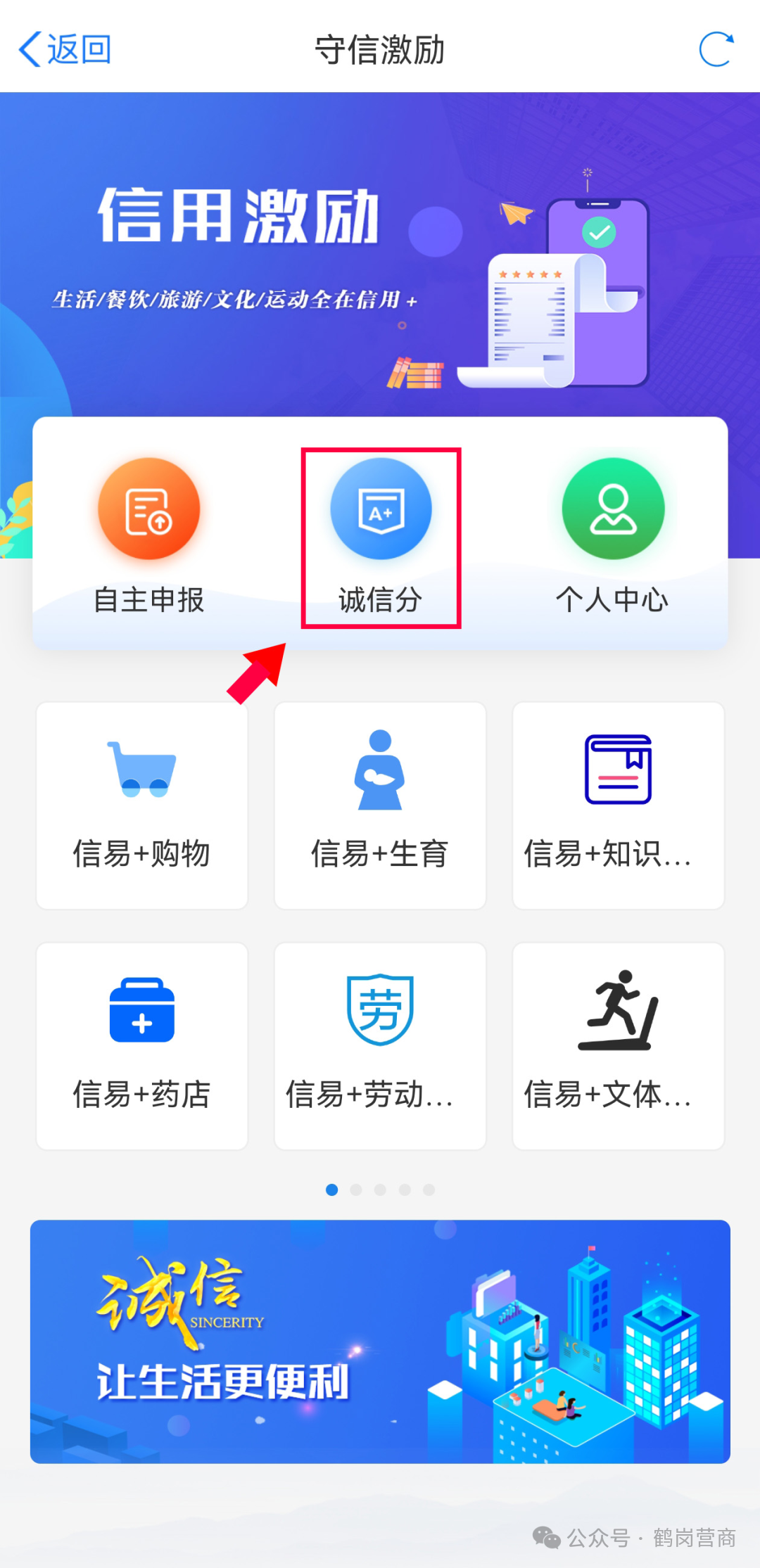 三、统一身份验证后登录“守信激励”,查看本人自然人诚信积分分值,根据自然人诚信积分所在等级,选择可参与的“信易+”场景;