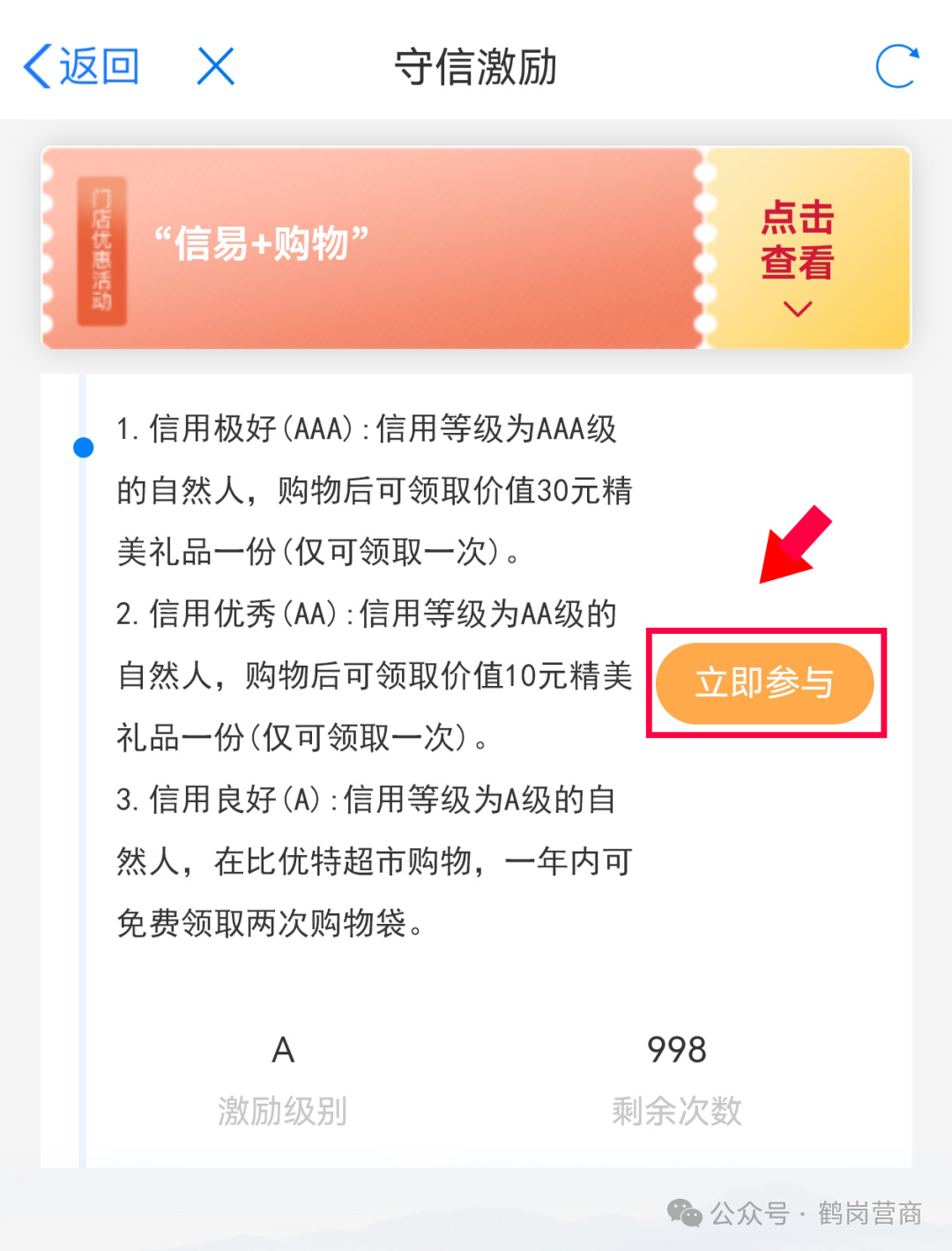 四、点击进入“信易+购物”场景,选择参与门店,找到“使用惠民优惠”,根据自然人诚信等级,查看可参与的活动,点击“立即参与”,商户进行现场核销后,即可享受相应场景优惠政策;