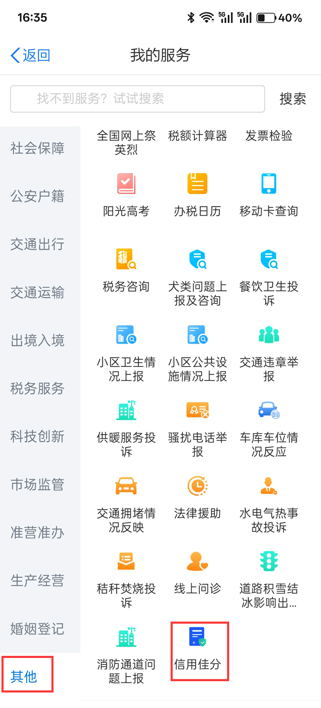 二、左侧导航选择“其他”划到最下面,找到“信用佳分”;