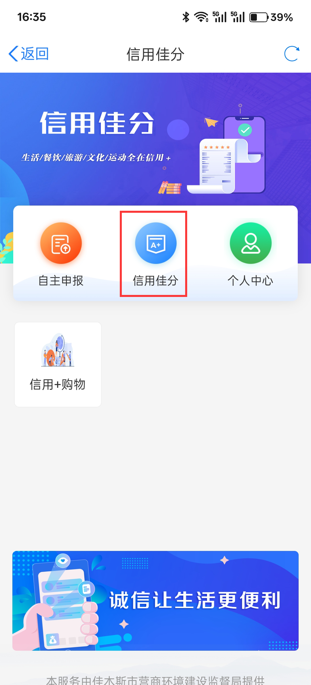 三、点击“信用佳分”跳转到统一身份认证登录,登录后进入“信用佳分”首页界面,可查看本人信用积分分值,根据自然人信用积分分值所在等级,选择可参与的信易+场景;