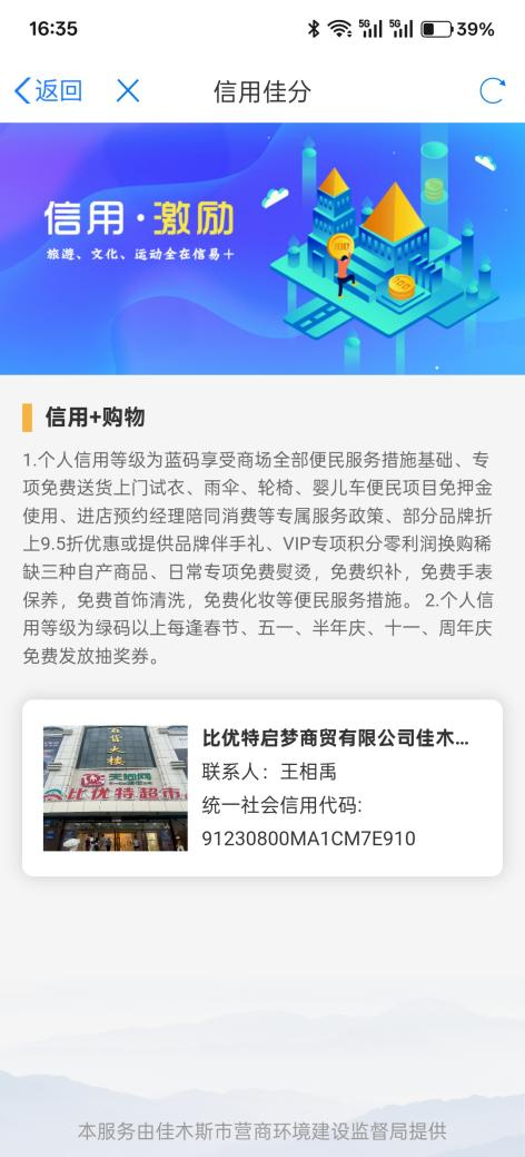 市民在三地经营试点超市(鹤岗市:金广超市振兴店和比优特超市黎明分店、双鸭山市:比优特超市松江国际分店、佳木斯市:比优特超市佳木斯百货大楼分店)消费后,可按照以下流程操作:龙易办APP(原“全省事”APP)→守信激励模块→登录(实名认证)→诚信分(确认诚信积分等级)→信易+购物→使用惠民优惠。