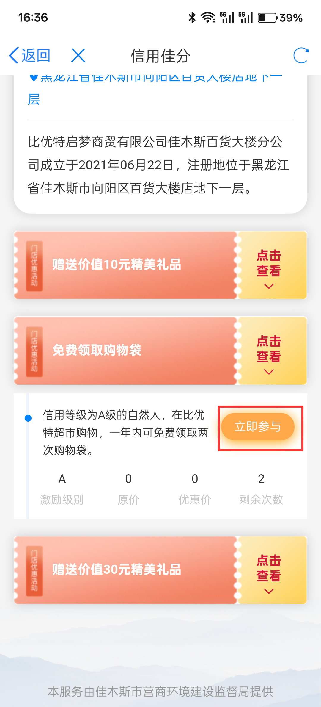 四、进入“信易+购物”场景,选择要参与的门店,点击进入,往下找到“使用惠民优惠”,根据自己的信用分数及等级,查看可参与的活动,点击“立即参与”,超市进行现场核销后,即可享受相应场景优惠政策;