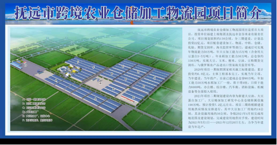 通过招商引资成功引进福建上瑞集团,该集团继续投资抚远市跨境农业仓储加工物流项目二期建设,规划建设内容为新建大豆油、大豆蛋白加工厂及仓储附属设施100万吨,预计投资4.6亿元左右。项目二期分三年建设,将根据建设用地供应情况安排进行。其中2021年预计投资1.42亿元,建设大豆初加工生产线、仓储设施30万吨;2022年预计投资1.41亿元,建设大豆浓缩蛋白生产线、仓储设施30万吨;2023年预计投资1.77亿元,建设大豆分离蛋白生产线、建设仓储设施40万吨。现已完成可研,规划选址等前期工作,